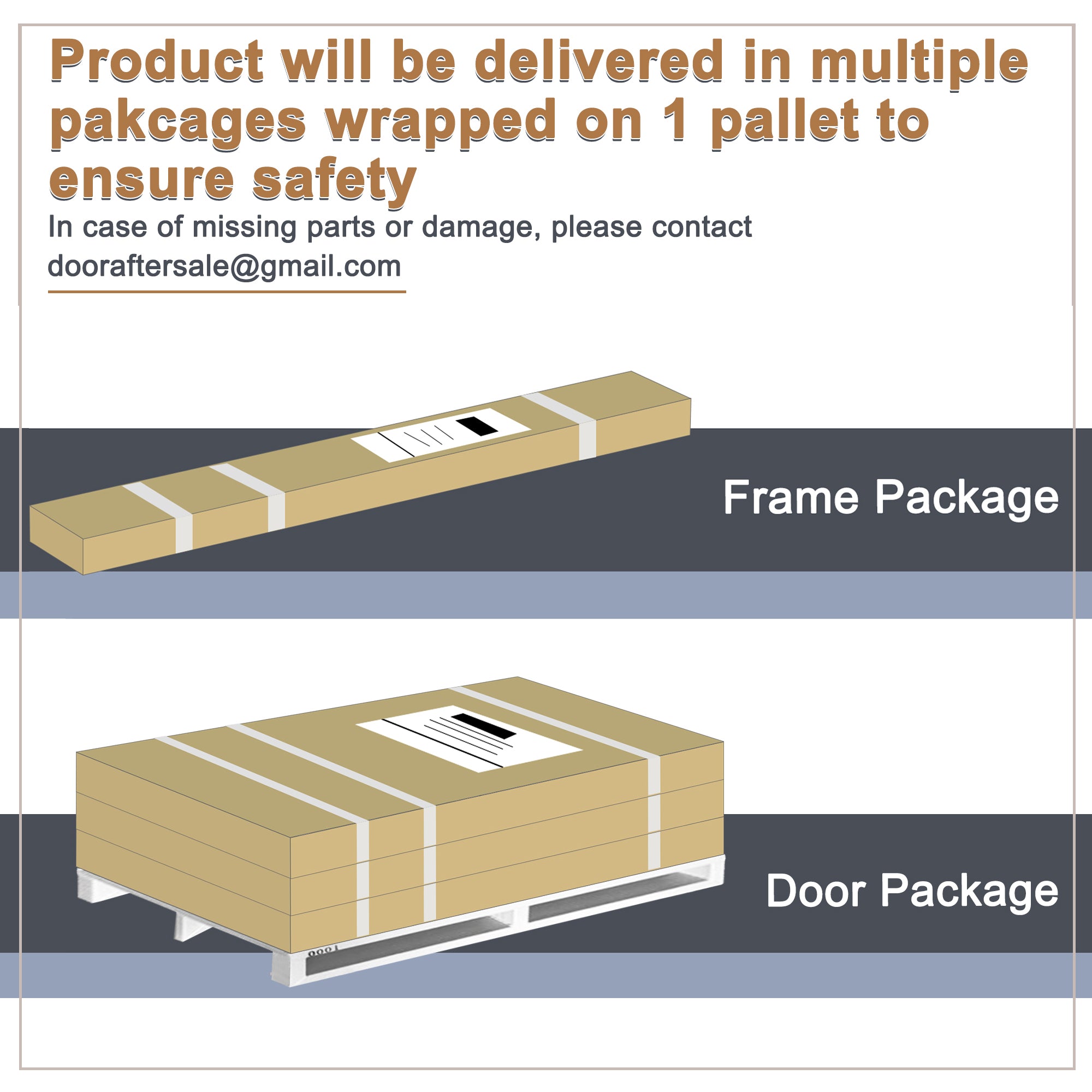 Including: The package includes hardware package, frame package, and door package, among which door package may vary according to the size and specifications of the door you purchased. Please pay attention when signing for the package. If you find any issues including missing parts or damage during package delivery, please contact dooraftersale@gmail.com.